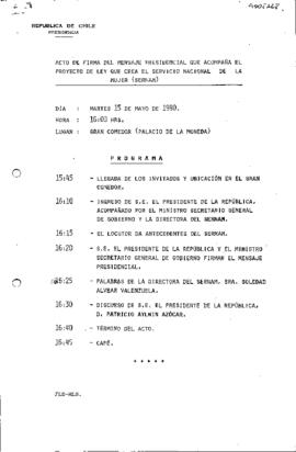 Acto de firma del mensaje presidencial que acompaña el proyecto de ley que crea el Servicio Nacional de la Mujer (SERNAM), realizado el 15 de mayo de 1990 en el Palacio de La Moneda