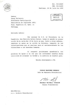 Acuso de recibo carta del 19 de julio en que, expresan su apoyo en la acción de Gobierno, respecto de las investigaciones que se realizan para el esclarecimiento de las violaciones a los derechos humanos.