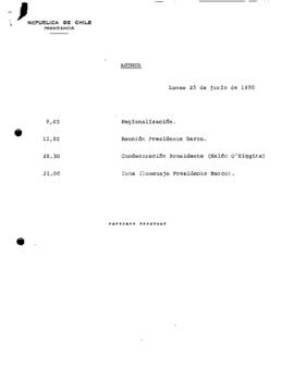 Agenda presidencial del lunes 25 de junio de 1990, que incluye las actividades oficiales del Presidente de la República de Chile. Señala reuniones sobre regionalización, un encuentro con el Presidente Virgilio Barco, y actos protocolares de condecoración y cena de homenaje en honor al mandatario colombiano
