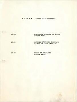 Detalle de reuniones, ceremonias y actividades programadas. Incluye audiencias con autoridades, encuentros con organizaciones comunitarias, actos protocolares y eventos en la Escuela Naval y el Palacio de Cerro Castillo. Constituye un registro de programación diaria de actividades institucionales.