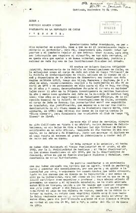 El remitente expone su trayectoria profesional, méritos, distinciones y desempeño institucional, a la vez que describe su situación personal y familiar. Solicita la revisión de su llamado a retiro, argumentando injusticia en la decisión y pidiendo al Presidente intervenir para restituir su situación laboral