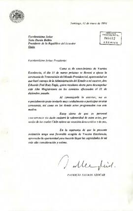 Carta del Presidente de la República de Chile, Patricio Aylwin Azócar, al Presidente de la República del Ecuador, Sixto Durán Ballén, informándole de la ceremonia de Transmisión del Mando Presidencial del 11 de marzo, e invitándole a participar en ella.