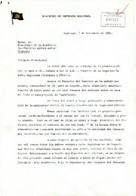 Carta del Ministro de Defensa Nacional, sr. Patricio Rojas Saavedra, dirigida al Excmo. Sr. Presidente de la República Don Patricio Aylwin Azócar