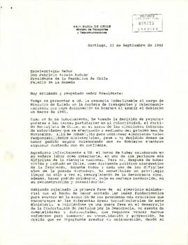 Carta del Ministro de Transportes y Telecomunicaciones, sr. Germán Correa Díaz, dirigida al Excelentísimo Señor Don Patricio Aylwin Azócar Presidente de la República de Chile