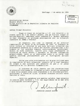 En la carta Aylwin acusa recibo de su carta anterior y expresa la preocupación de Chile por la situación en Jammu y Kashmir [territorio en disputa entre India y Pakistán], reiterando que esta debe resolverse conforme al derecho internacional y al respeto de los derechos humanos. Asimismo, agradece la información entregada por el Enviado Especial pakistaní y lamenta que las conversaciones bilaterales entre Pakistán e India no hayan progresado