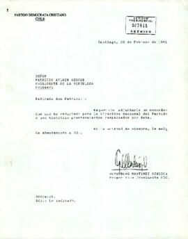 Carta del sr. Gutenberg Martínez Ocamica, Primer Vicepresidente del PDC, dirigida al señor Patricio Aylwin Azócar, Presidente de la República