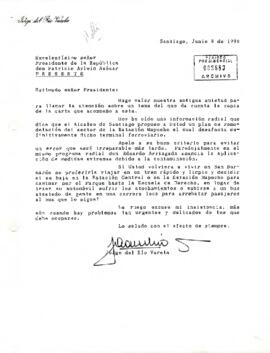 Carta enviada por Jorge del Río Varela al presidente Patricio Aylwin Azócar. El autor, apelando a su amistad con el mandatario, manifiesta su preocupación por el proyecto de remodelación del sector de la Estación Mapocho, que implicaría su desafectación como terminal ferroviario. Solicita reconsiderar la medida por su valor urbano y ambiental, señalando que mantener el servicio ferroviario beneficiaría la movilidad y reduciría la contaminación en Santiago