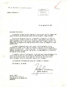 Carta del sr. Rafael Moreno R., dirigida al Excmo. Señor Don Patricio Aylwin A., con referencia al apoyo de Ecuador a la candidatura chilena a la FAO