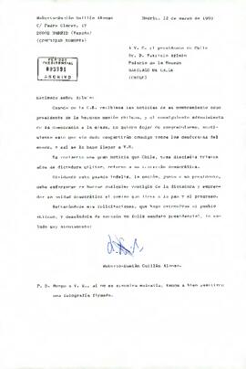 Político, abogado y jurista. Fundador del Partido Demócrata Cristiano, fue presidente del Senado de 1971 a 1972 y presidente de la República durante el período comprendido entre 1990 y 1994. Aylwin fue el primer presidente democráticamente elegido tras el Golpe de Estado en Chile de 1973, en el que fue derrocado Salvador Allende y se instauró el Régimen Militar encabezado por Augusto Pinochet Ugarte. Así, el mandato de Aylwin dio inicio al periodo conocido como la Transición a la democracia y el primero de los cuatro gobiernos consecutivos de la Concertación de Partidos por la Democracia.