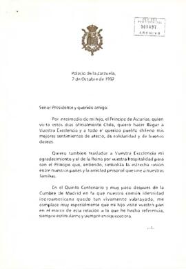 Carta desde el Palacio de la Zarzuela, del Rey Juan Carlos I de España dirigida al Señor Presidente y querido amigo [Presidente Patricio Aylwin]