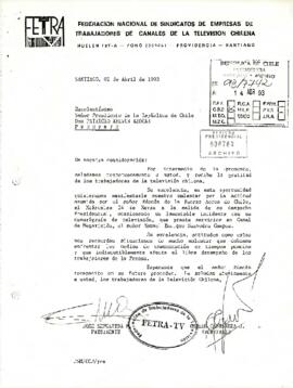 Carta desde la Federación Nacional de Sindicatos de Empresas de Trabajadores de Canales de la Televisión Chilena, dirigida al Excelentísimo Señor Presidente de la República de Chile, Don Patricio Aylwin Azócar