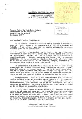 Carta desde Madrid, de Unión Liberal Cubana [Miembro de la Internacional Liberal] de su Presidente, sr. Carlos Alberto Montaner, dirigida al Excmo. Señor D. Patricio Aylwin Presidente de la República