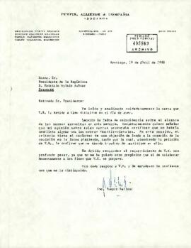 Carta desde Pumpin, Alliende & Compañía, Abogados, del sr. Guillermo Pumpin Belloni, dirigida al Excmo, Sr. Presidente D. Patricio Aylwin A.