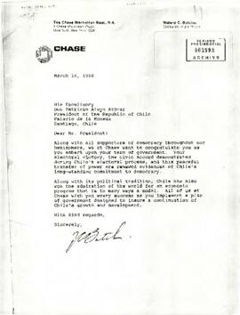 Carta desde The Chase Manhattan Bank, N.A. de Nueva York, Estados Unidos, del Presidente del Consejo, sr. Willard C. Butcher, dirigida a His Excellency Don Patricio Alwyn Azócar President of the Republic of Chile
