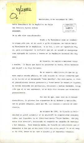 Carta enviada al Presidente Patricio Aylwin por el Agregado de Cultura y Prensa en Uruguay, sr. Emilio Rojas Gómez, quien expone su defensa frente a acusaciones derivadas del caso Berríos