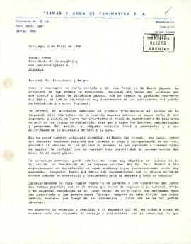 En esta carta el remitente expone las graves dificultades económicas que enfrenta la empresa tras un incendio ocurrido en diciembre de 1989, que afectó significativamente la actividad turística y comercial de la zona de Panimávida. Solicita la intervención del Presidente ante el Banco del Estado para facilitar la renegociación de la deuda de la empresa y el uso de las pólizas de seguro embargadas con el fin de reconstruir el hotel. Además, plantea la posibilidad de establecer un casino y convenios con entidades de salud para fomentar el termalismo social.