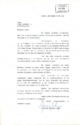 Carta enviada por Guillermo Quiroga Toloza al senador Jorge Lavandero para informarle que el Intendente de la IX Región solicitó su desvinculación al Ministerio de Agricultura, atribuyéndolo a su cercanía política con el senador
