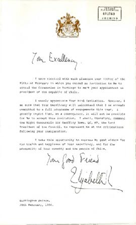 La Reina Isabel II agradece cordialmente la invitación, pero explica que su agenda oficial del año ya está comprometida, por lo que no podrá asistir. En su lugar, designa como representante al Lord Presidente del Consejo, Sir Geoffrey Howe, y transmite sus buenos deseos personales para el presidente y el pueblo de Chile