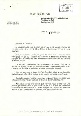 Carta enviada por Pierre Mauroy, secretario general del Partido Socialista francés, al presidente electo de Chile, Patricio Aylwin Azócar