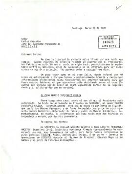 En la presente el infrascrito alerta sobre antecedentes profesionales, políticos y éticos del funcionario Marcio Gutiérrez Gyllen, entonces Gerente de Finanzas de SERCOTEC, detallando denuncias, irregularidades y una carrera funcionaria considerada anómala. El remitente solicita corregir la información entregada al Presidente y evitar que el caso derive en controversias públicas.