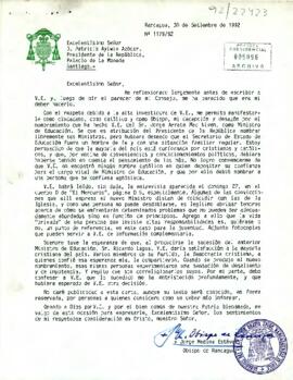 Carta Nº 1179/92 del Obispo de Rancagua, Monseñor Jorge Medina Estévez, dirigida al Excelentísimo Señor D. Patricio Aylwin Azócar, Presidente de la República