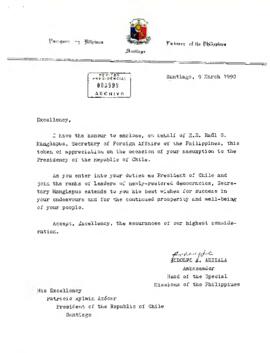 En nombre del Ministro de Relaciones Exteriores de Filipinas, Raúl S. Manglapus, la carta expresa un saludo protocolar y felicitaciones por la asunción de Aylwin a la Presidencia de Chile, destacando la incorporación del país al grupo de democracias recientemente restablecidas y deseando prosperidad y éxito a su gobierno