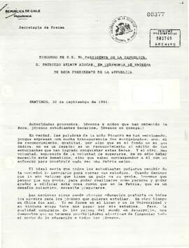 Discurso del Presidente Patricio Aylwin Azócar durante la ceremonia de entrega de la Beca Presidente de la República. En su intervención, el mandatario destaca el mérito académico de los estudiantes beneficiados, la importancia del esfuerzo personal y el compromiso del Estado con la equidad educativa. Además, reflexiona sobre el rol de los docentes, la necesidad de mejorar sus condiciones laborales y la búsqueda de un desarrollo nacional basado en el crecimiento con justicia social