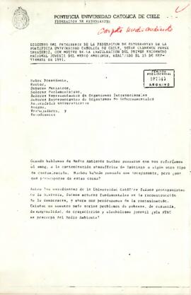 Discurso del Presidente de la Federación de Estudiantes de la Pontificia Universidad Católica de Chile, sr. Clemente Pérez Errázuriz, con motivo de la inauguración del Primer Encuentro Nacional Juvenil del Medio Ambiente, realizado el 25 de septiembre de 1991