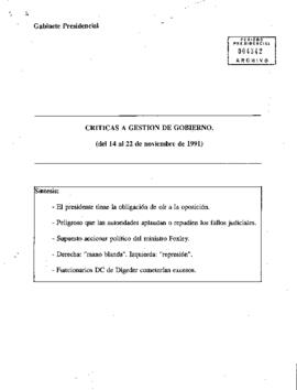 Documento de análisis elaborado por el Gabinete Presidencial que recopila y sistematiza críticas a la gestión del gobierno del Presidente Patricio Aylwin entre el 14 y el 22 de noviembre de 1991