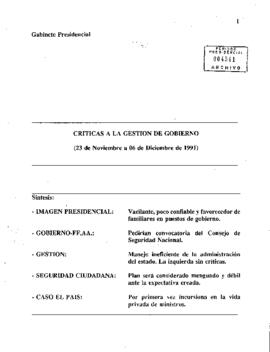 Documento de carácter analítico elaborado por el Gabinete Presidencial que sistematiza y resume críticas públicas a la gestión del gobierno del Presidente Patricio Aylwin, registradas entre el 23 de noviembre y el 6 de diciembre de 1991