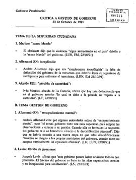Documento elaborado por el Gabinete Presidencial que sistematiza críticas a la gestión del Gobierno del Presidente Patricio Aylwin correspondientes al 23 de octubre de 1991