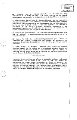 El documento aborda la respuesta del Gobierno de Chile ante la acusación de la FDA sobre uvas chilenas contaminadas en 1989. El Presidente expresa confianza en que los empresarios afectados obtendrán justicia en tribunales estadounidenses. Si no logran compensación, el Estado chileno brindará protección diplomática. Además, se buscará indemnización por los daños sufridos por el país y su economía. Finalmente, se iniciarán gestiones diplomáticas con Estados Unidos para resolver el conflicto conforme al derecho internacional.