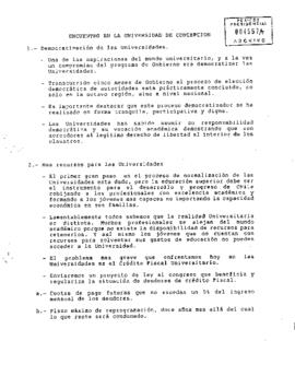 Documento que recoge los principales ejes abordados en un encuentro realizado en la Universidad de Concepción, centrado en la democratización de las universidades, el fortalecimiento del financiamiento de la educación superior y el rol de las universidades en la regionalización