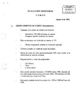 Evaluación de CORFO que informa sobre su reestructuración financiera, venta de créditos y reducción de deuda. Destaca la creación de comités regionales, la participación privada en servicios sanitarios y el apoyo a la pequeña y mediana empresa como nueva prioridad institucional.