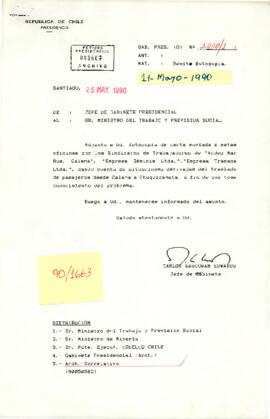 Por medio de la presente se remite una fotocopia de la carta de tres sindicatos de choferes de Calama, quienes denuncian problemas derivados del transporte de pasajeros hacia Chuquicamata. El documento solicita al ministro tomar conocimiento de la situación y mantener informada a la Presidencia sobre las gestiones realizadas