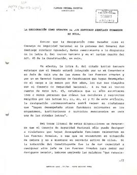 Informe jurídico elaborado por el abogado Carlos Guerra Estévez, en el cual se argumenta que la designación del general Santiago Sinclair Oyaneder como senador por el Consejo de Seguridad Nacional es nula. Sostiene que, según el artículo 45 de la Constitución, solo podían ser designados ex comandantes en jefe o ex funcionarios en retiro, y que Sinclair fue designado mientras aún estaba en servicio activo, por lo que no cumplía los requisitos constitucionales y su nombramiento carece de validez