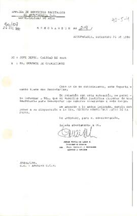 Memorándum Nº219 del Jefe de Depto. Calidad del Agua, sr. Jorge Ponce de León, dirigida al sr. Gerente de Operaciones