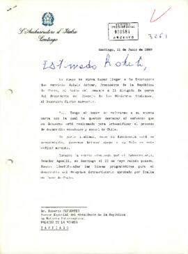 Nota diplomática desde la Embajada de Italia en Chile, dirigida al asesor internacional del Presidente de la República, Roberto Cifuentes