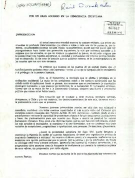 Contiene un diagnóstico político e ideológico tras el retorno a la democracia, reflexionando sobre los cambios globales y nacionales, el rol del humanismo cristiano y la responsabilidad del partido en apoyar al Gobierno de Patricio Aylwin. Desarrolla lineamientos para fortalecer la Concertación, mejorar la relación Gobierno–partido–ciudadanía, promover la transparencia y la participación social, y enfrentar la elección de una nueva directiva interna sin divisiones