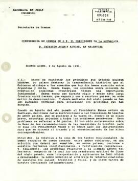 Transcripción de la conferencia de prensa del Presidente de Chile, sr. Patricio Aylwin Azócar, realizada en Buenos Aires el 2 de agosto de 1991